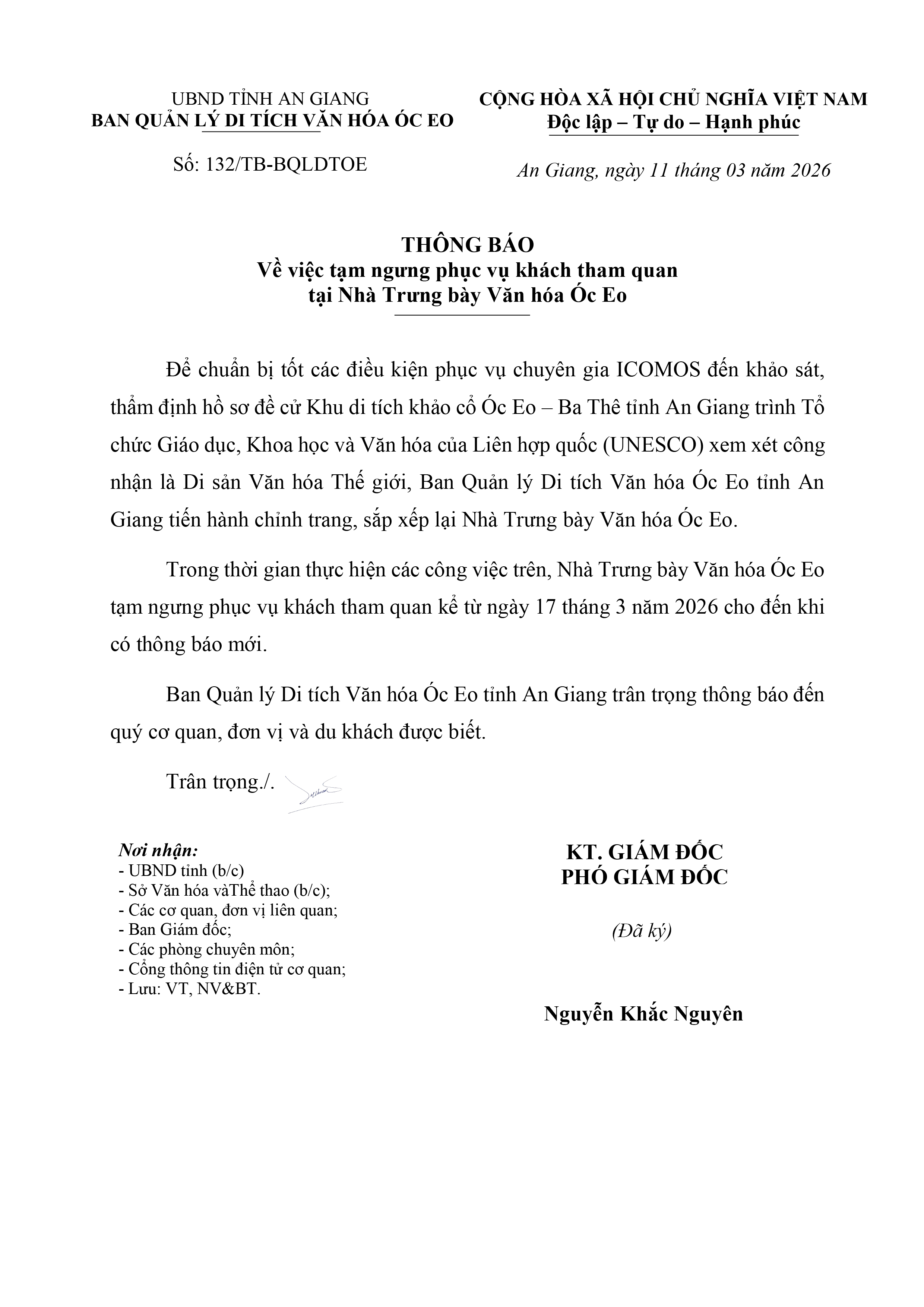 aA Thông báo THÔNG BÁO Về việc tạm ngưng phục vụ khách tham quan tại nhà Trưng bày Văn hóa Óc Eo 13/03/2026, 09:23 Quay về Chia sẻ Copy link thành công Tin khác THÔNG BÁO Tuyển dụng nhân viên Bảo vệ kiêm chăm sóc cây kiểng Ban Quản lý Di tích Văn hóa Óc Eo tỉnh An Giang Thông báo 31/03/2026 Bản tin đột xuất nhận định mưa lũ trên lưu vực sông Mê Công và vùng ĐBSCL do ảnh hưởng của cơn bão số 5 - (25/08/2025) Thông báo 26/08/2025 Tin bão Khẩn cấp(Cơn bão số 5) Thông báo 26/08/2025 Tin cuối cùng về cơn bão số 5 Thông báo 26/08/2025 /thong-bao-ve-viec-tam-ngung-phuc-vu-khach-tham-quan-tai-nha-trung-bay-van-hoa-oc-eo